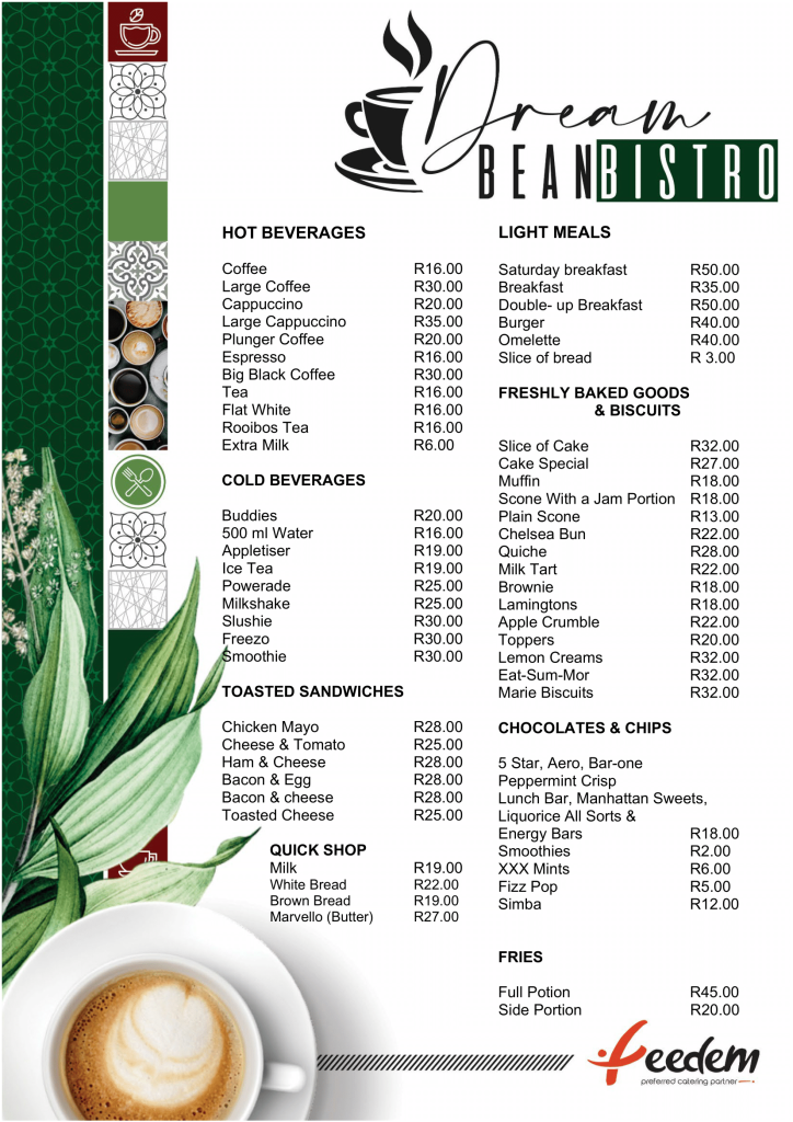 Breakfast, Teas, Coffee and Pastries are served in the dream Bean Coffee Corner from 08:00 to 11:30, 11:30 to 13:30 closed for lunch, and 13:30 to 15:00