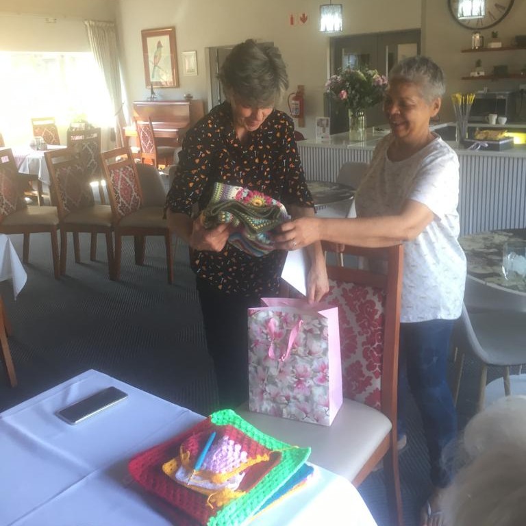 The ladies of the VGH 1 Chatterbox group presented Chantell Minaar, VGH 1 catering manager, a crocheted blanket for her birthday. Sharol thanked Chantell for her dedicated service and the help she provides the residents.